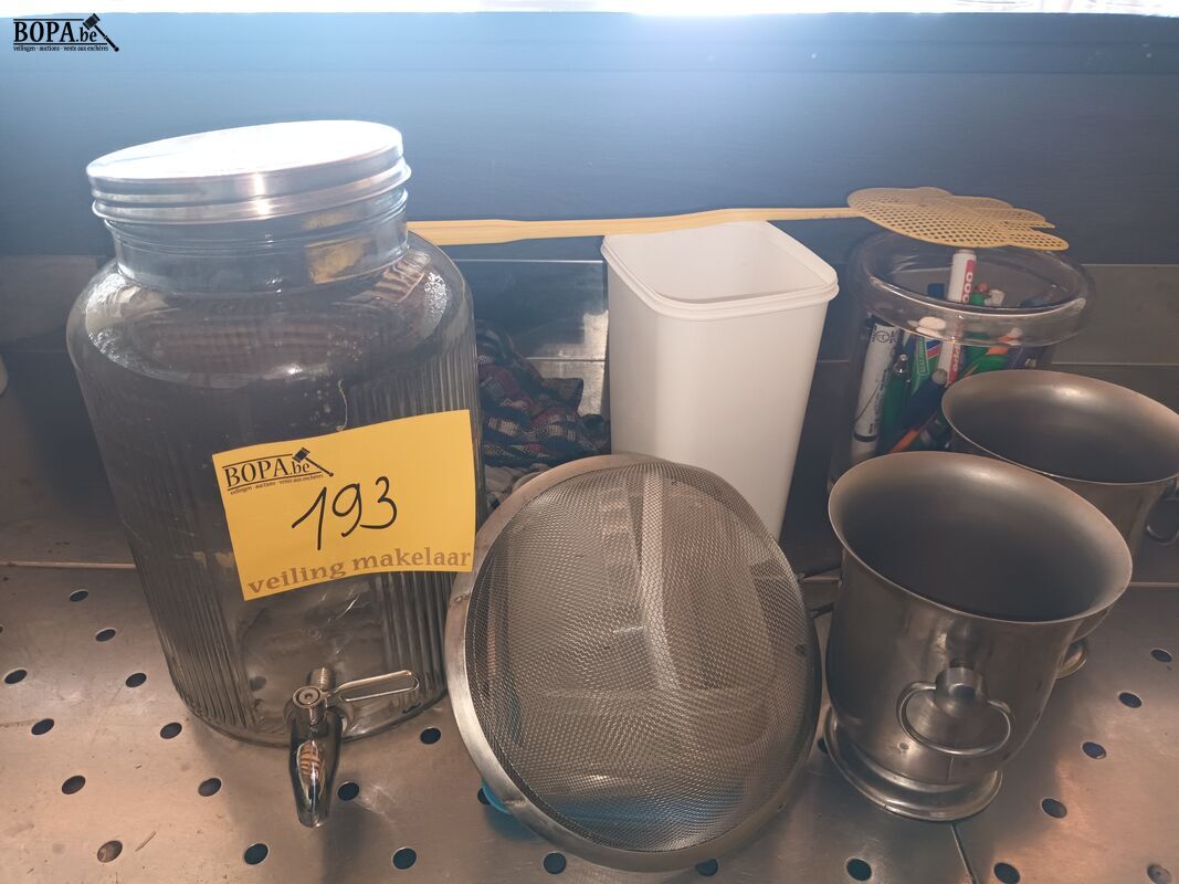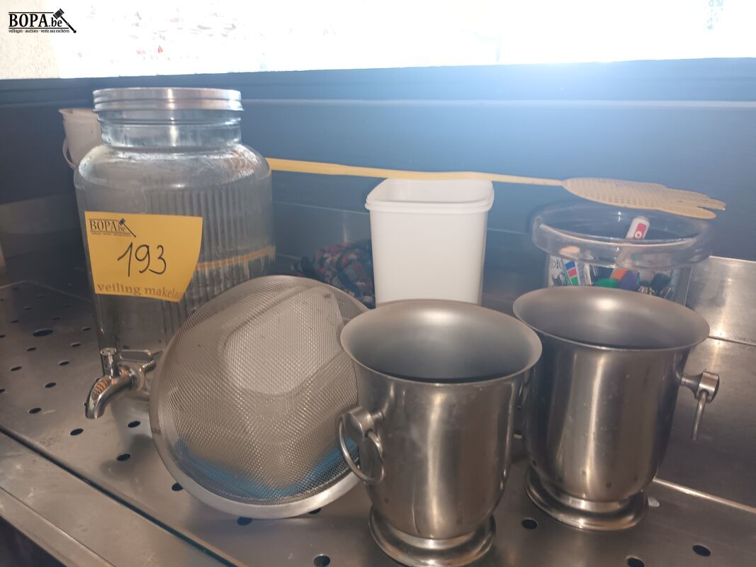 Diversen zoals wijnkoelers, schrijfgerei, zeef, drankendispenser.