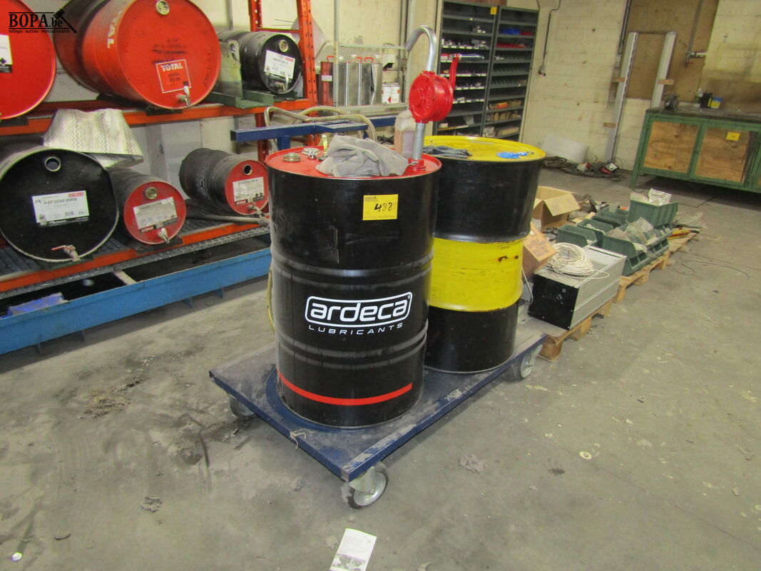 Transportkar met 2 olievaten van 210 liter met bijhorende pompen. 133 x 83 x 120 cm.