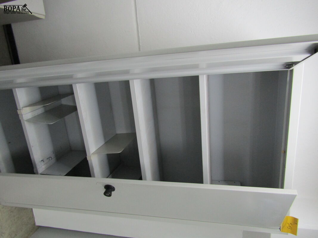 Metalen archiefkast met 2 deuren en 4 legbanken. Met sleutel. 92 x 40 x 195 cm.
