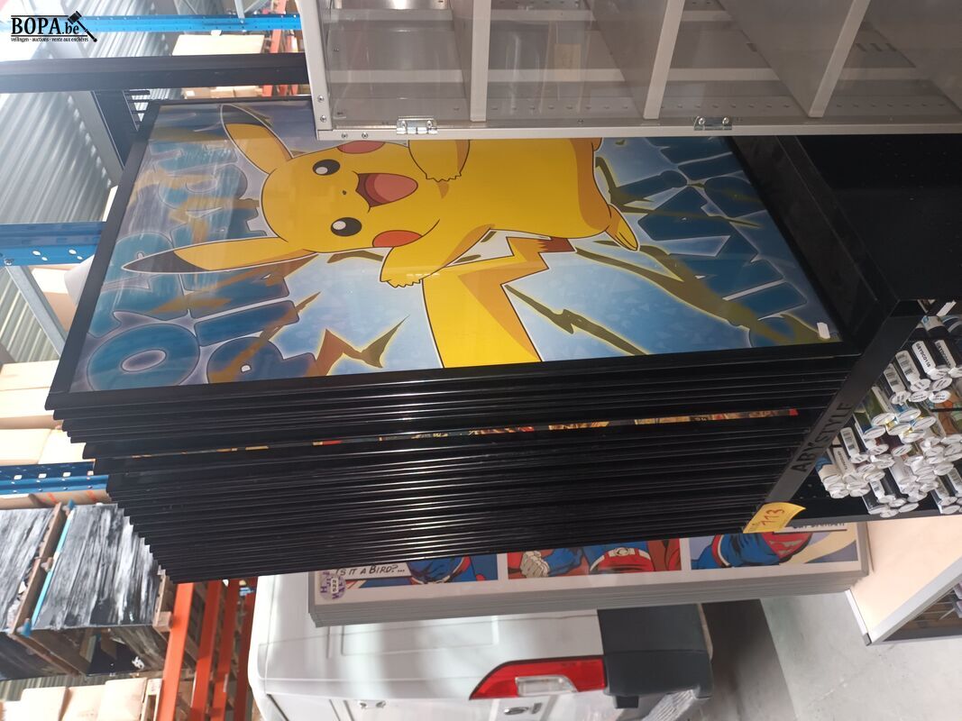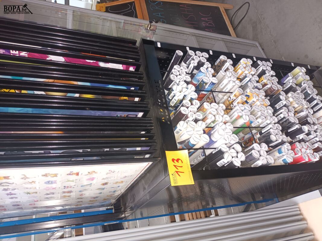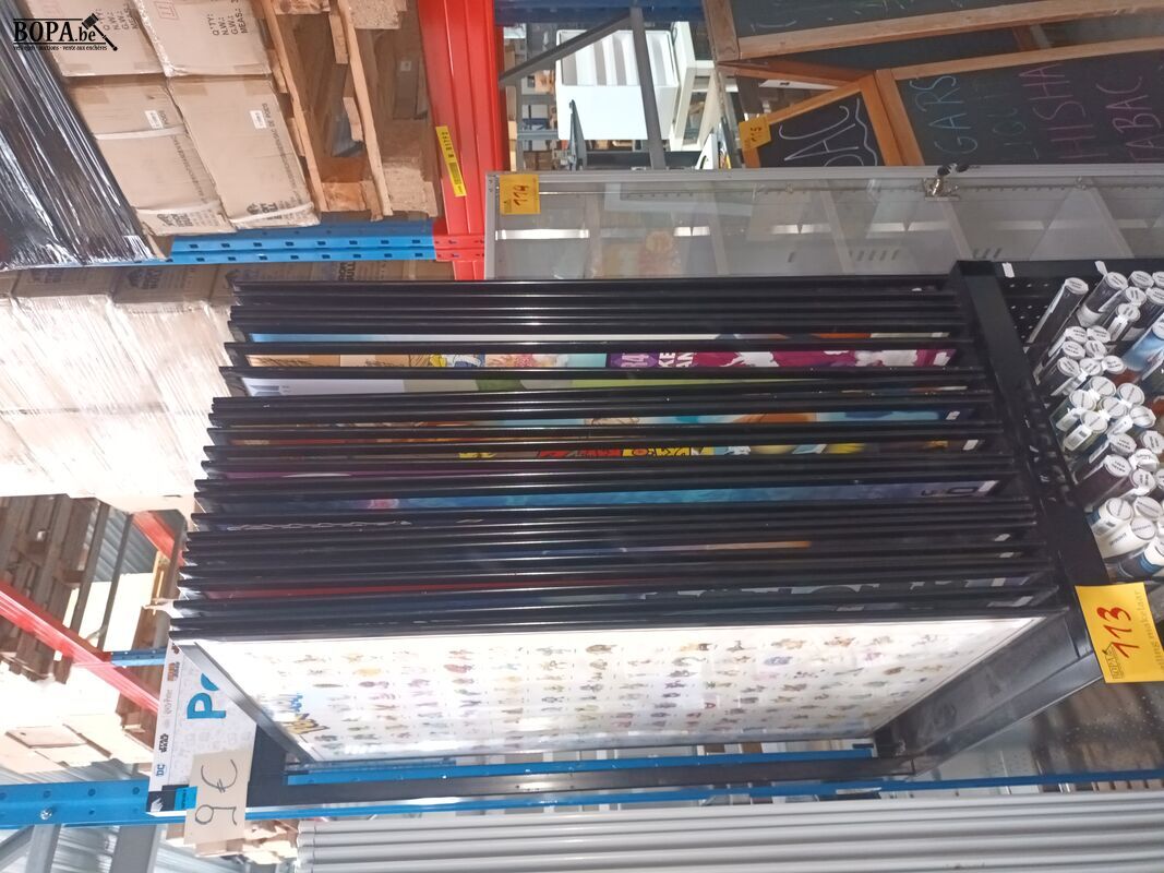 Draaibare wandhouder voor posters gevuld met posters. 59 x 62 x 205 cm. Deze kast is op wielen.
