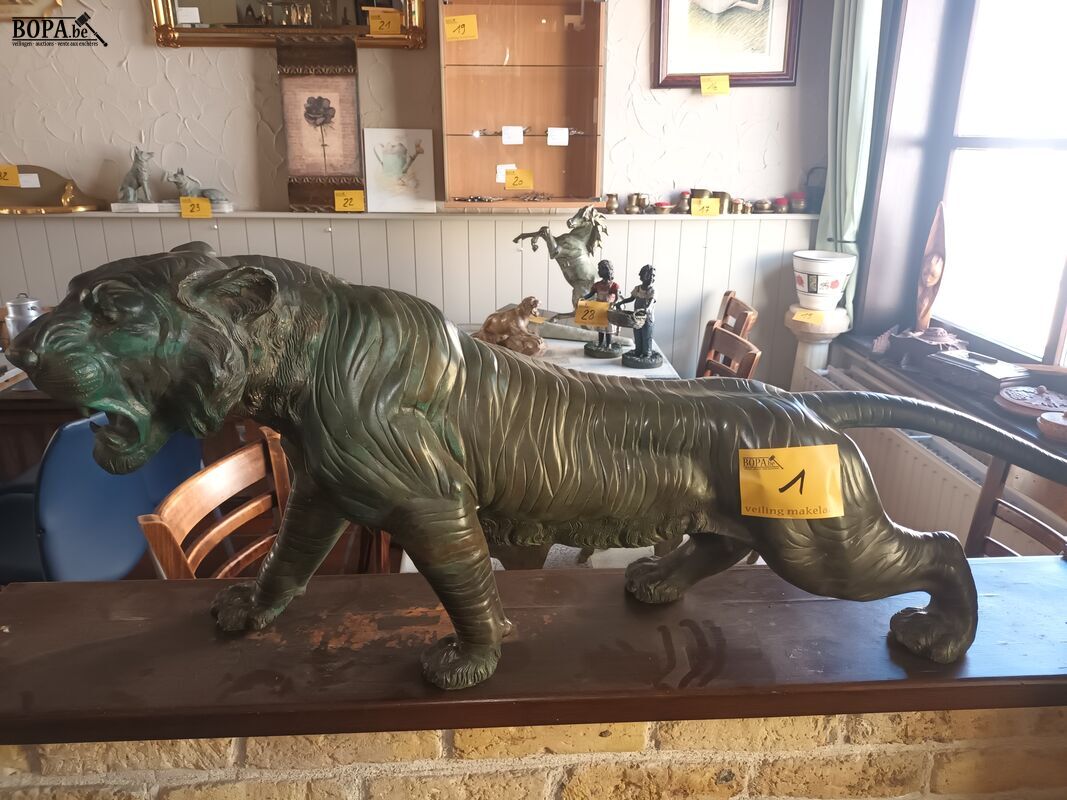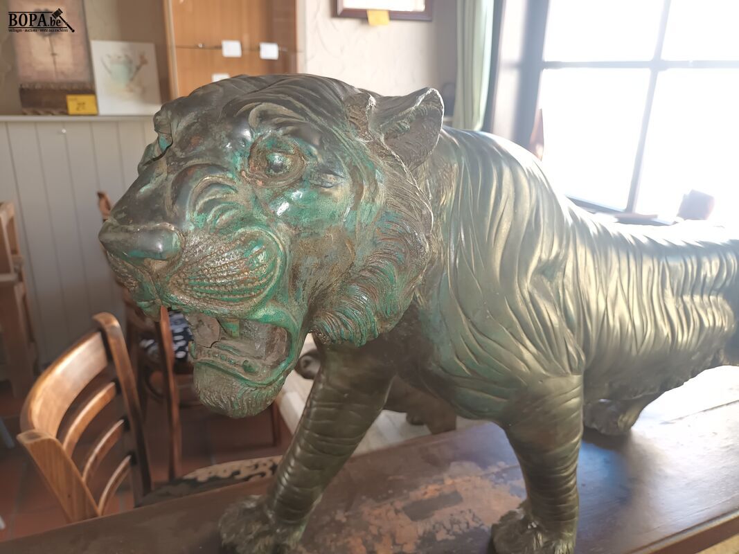 Grote tijger in brons getekend C. Valton. 120 x 25 x 46 cm.