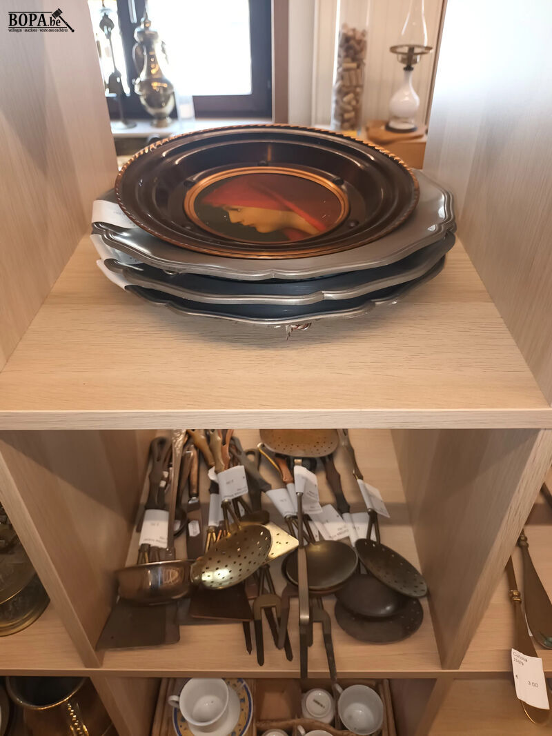 5 kastvakken met koperwerk, decoratie en huisraad