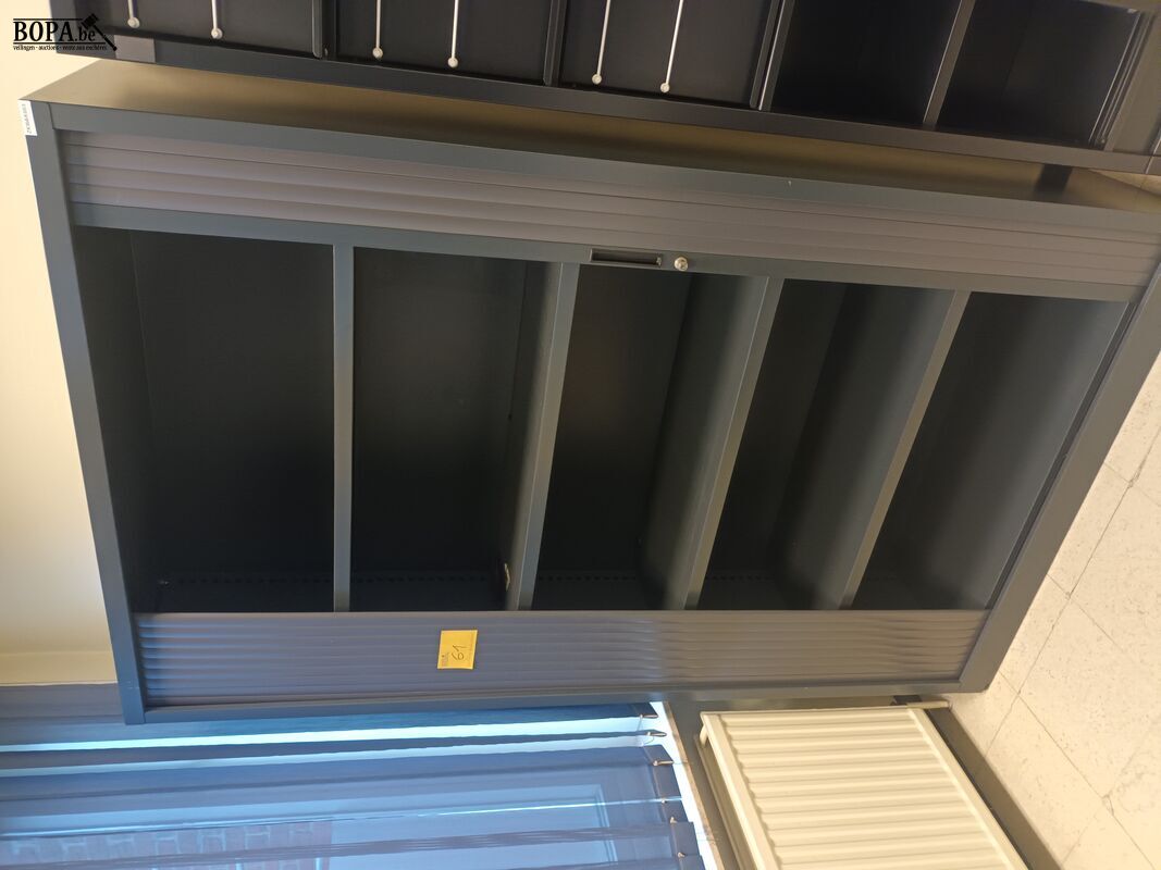 Hoge antraciet roldeurkast. 120 x 40 x 198 cm. Met 1 kapotte deur en geen sleutel.