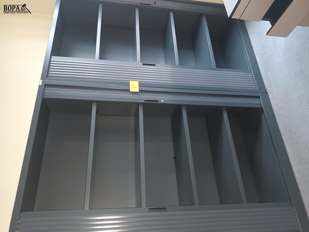 Hoge antraciet roldeurkast. 2 stuks. 120 x 42 x 200 cm. 1 met sleutel en 1 zonder sleutel.
