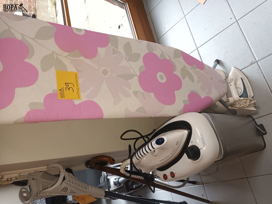 1 strijkplank Brabantia, 2 strijkijzers en een vuilnisemmer.