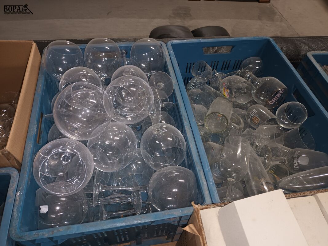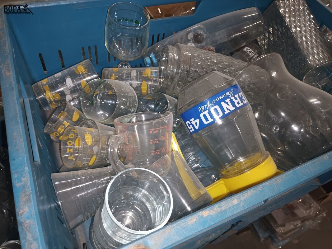 Groot lot diverse glazen. 6 bakken en 2 dozen. Bakken niet inbegrepen.