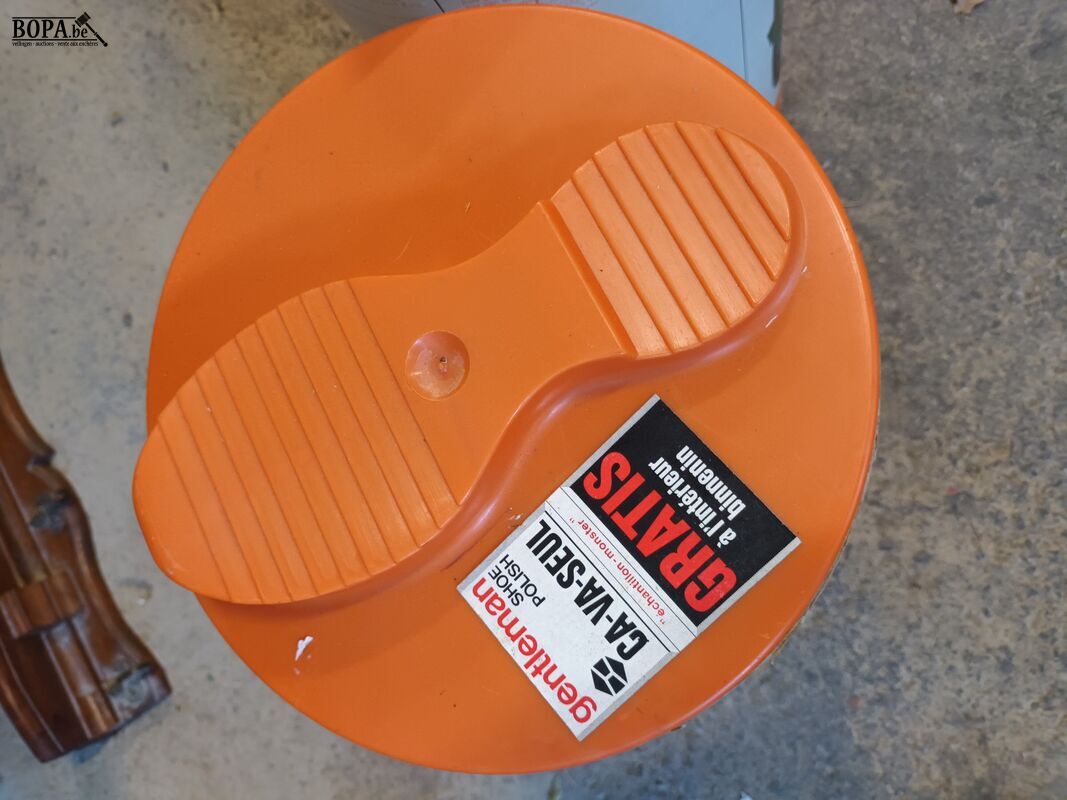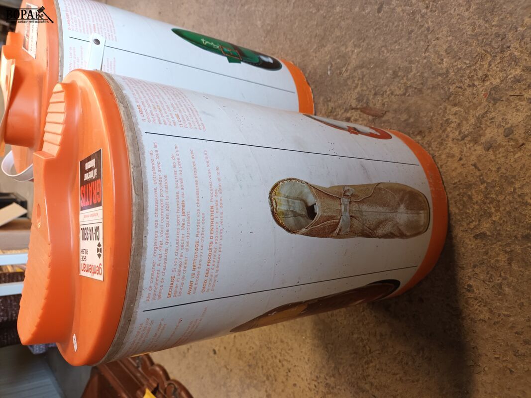 Retro schoenpoetsdozen met opbergruimte en versteviging om je voet op te zetten. 2 stuks. Diameter 24cm. Hoogte 43cm.