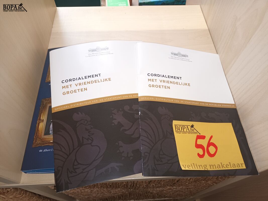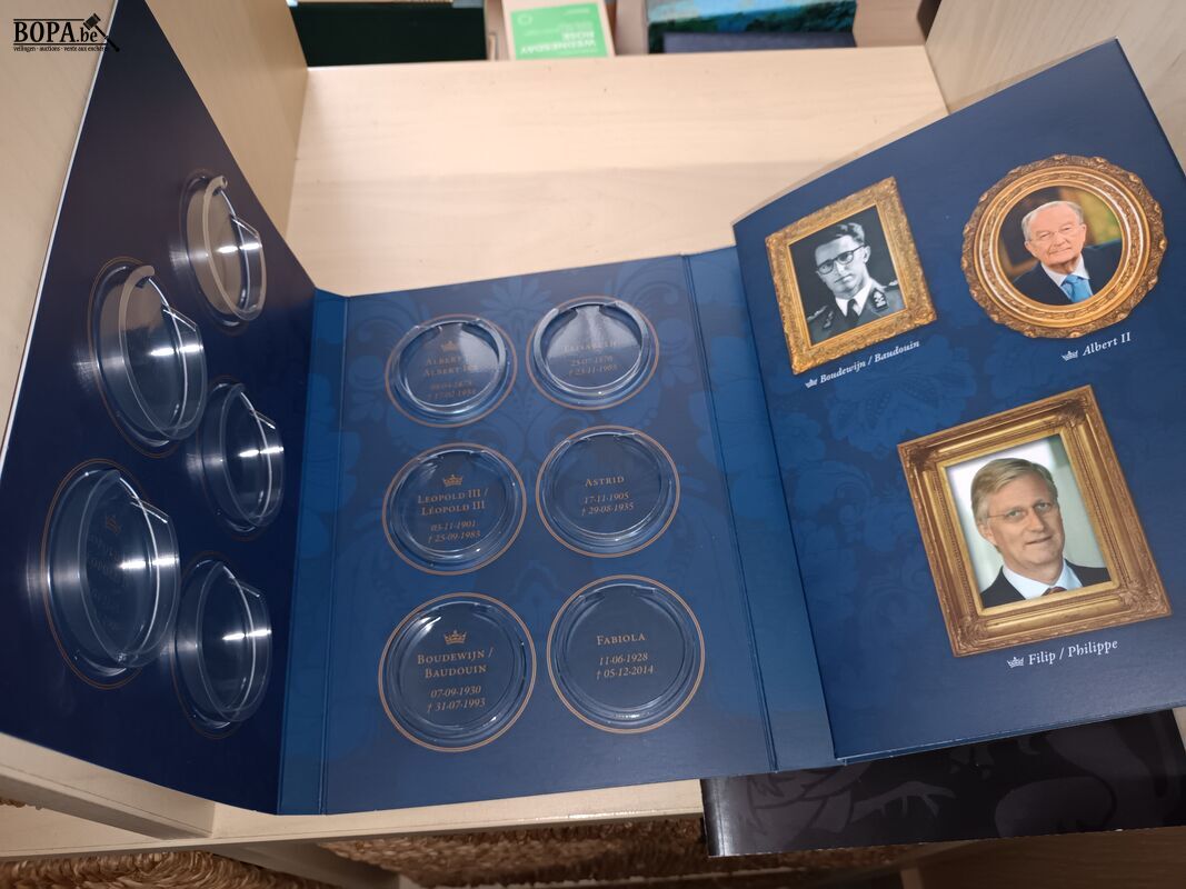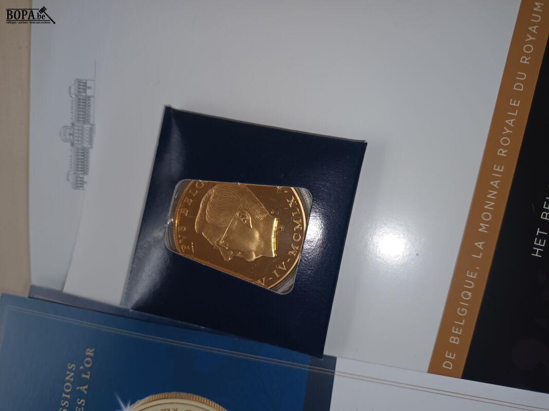 2 vergulde verzamelmunten van het Belgisch Koningshuis Filip en Mathilde met certificaten en 1 verzamelmap voor munten.