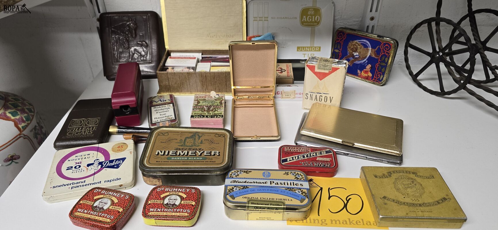 Rook accessoire set, metalen dozen, pakje sigaretten, blaadjes, lucifers, sigaretten roller, sigarettenhouders…