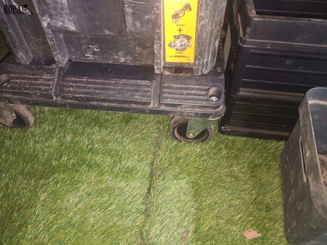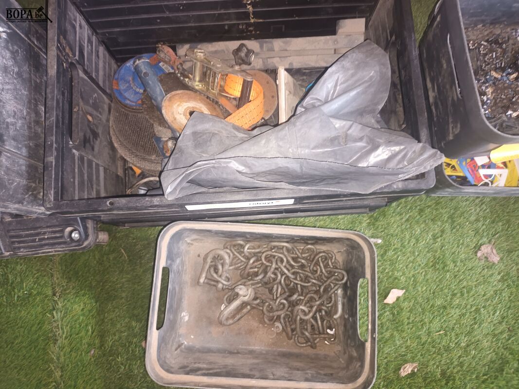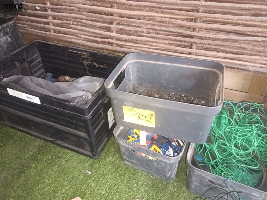 Lot werkmateriaal. 8 bakken met materiaal, 1 platte kar en 1 bidon.