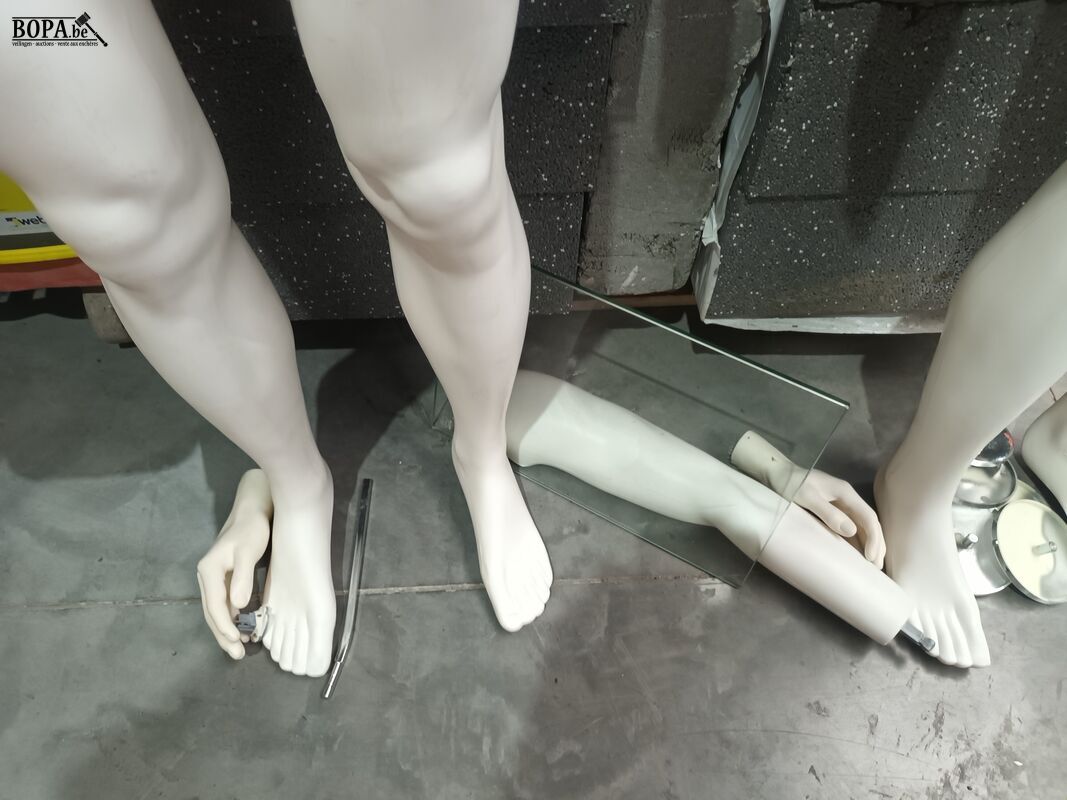 2 mannelijke etalagepoppen waarvan 1 met glazen voet. Hoogte 185 cm.