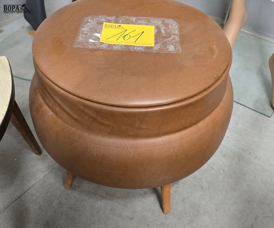 Vintage naaipoef met verdeelvaken deksel en vintage driehoekig bijzettafeltje
