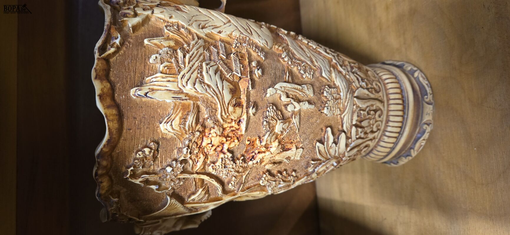 2 Italiaanse resin vazen uit de jaren '60 - '80 gemaakt in resine (hars) met Aziatische landschappen in reliëf en 2 handgrepen in olifantenkoppen