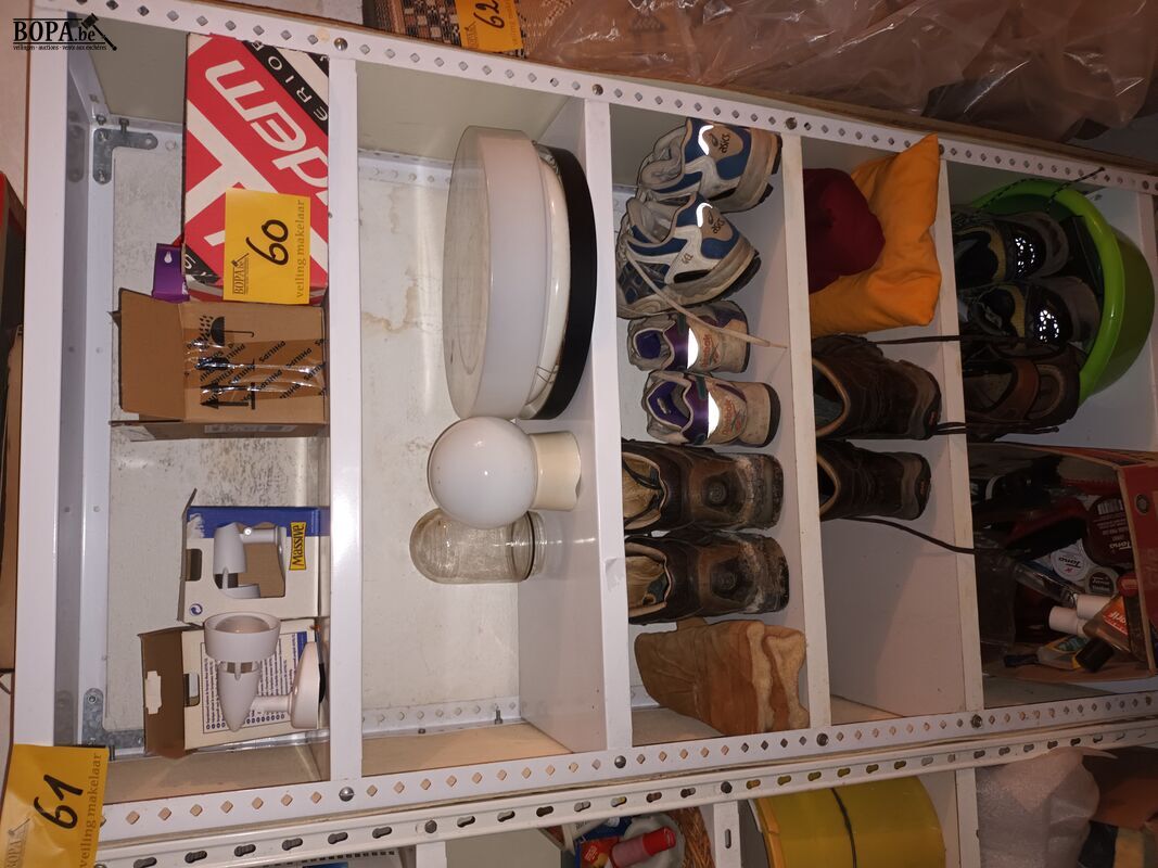 Verlichting, lampen, schoenpoetsmateriaal en schoenen. Inhoud rek.