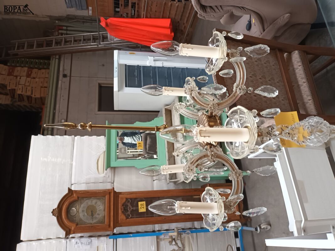 Staande lamp met koper en glas. Hoogte 174 cm.